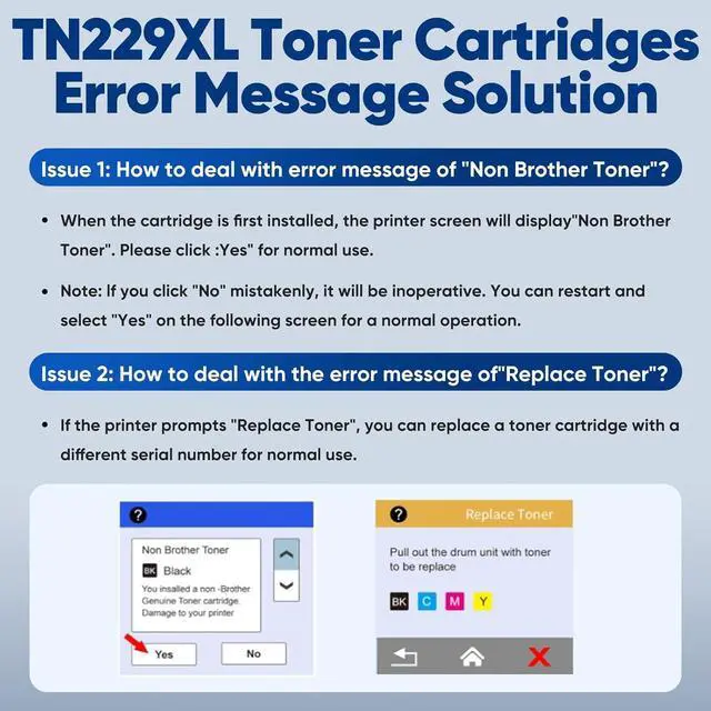 Corapipo TN229XL Toner Cartridge set includes 2 Black TN229XL Black Toner Cartridge and 3 TN-229XL(Cyan, Magenta, Yellow) Cartridgesthis 5Pack 229XL Toner Cartridge Set ensures you have all necessary colors on hand, eliminating the hassle of frequent individual replacements