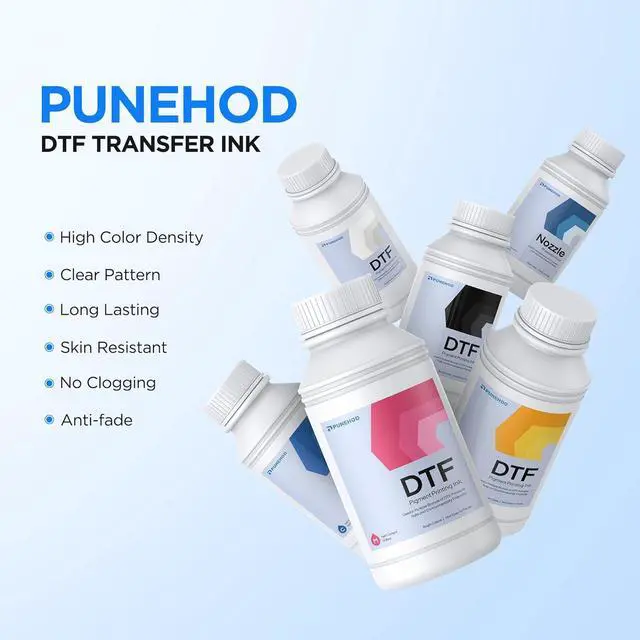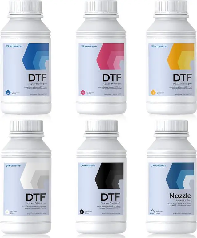 PUNEHOD DTF Ink Combo KitsFor the new ink set with moisturizing liquid, you will get 1 bottle of 250 ml moisturizing liquid (to keep the printhead moist); and 5 bottles of 250 ml DTF ink (for DTF transfer effect), including 1 bottle each of white ink, black ink, cyan ink, magenta ink and yellow ink
