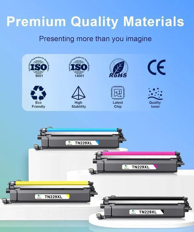 Package Included: 1 x TN229XL Black, 1 x TN229XL Cyan, 1 x TN229XL Yellow, 1 x TN229XL Magenta and 1 x user guide. Each TN229XL Toner cartridges is packaged independently to ensure that the product does not leak ink and damage. (There may be two different version)
