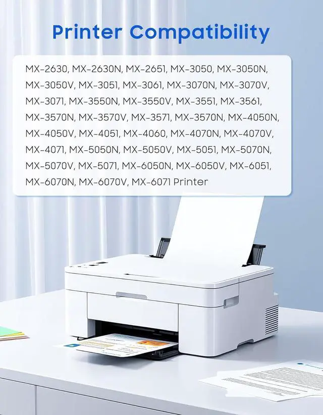 Compatible Printer Models: MX-2651 MX-3051 MX-3061 MX-3071 MX-3551 MX-3561 MX-3571 MX-4051 MX-4061 MX-2630N, MX-2651, MX-3050N, MX-3050V, MX-3070N, MX-3070V, MX-3071, MX-3550N, MX-3550V, MX-3551, MX-3570N, MX-3570V, MX-357, MX-4050N, MX-4050V, MX-4051, MX-4070N, MX-4071, MX-5050N, MX-5070N, MX-5070V, MX-6050N, MX-6050V, MX-6070N, MX-6070V, MX-3560V, MX-3060V Printer