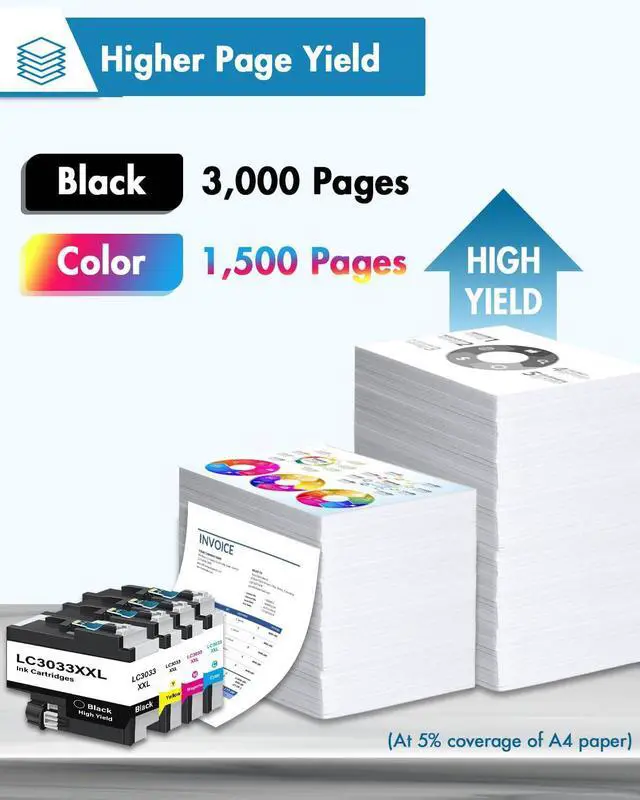 High Page Yield: Prints up to 3,000 pages per LC3033XXL black ink cartridges , up to 1,500 pages per LC3033XXL color ink cartridge (at 5% coverage)