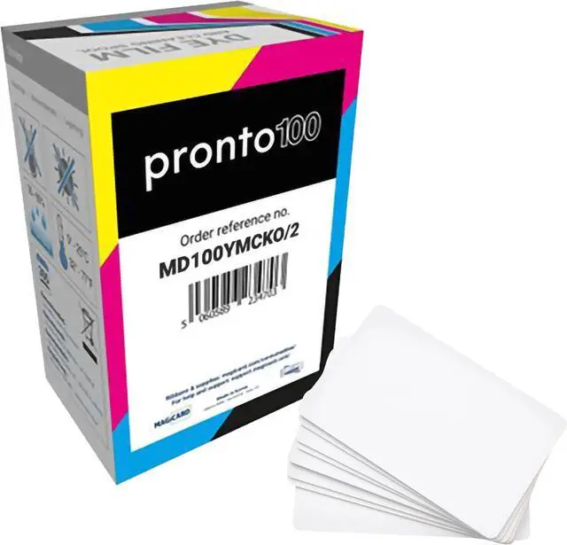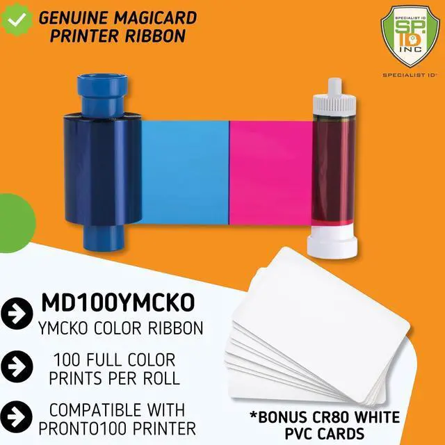 100% GENUINE MAGICARD PRINTER RIBBON - Box Labeled MD100YMCKO/2 is the Official OEM Magicard Pronto 100 YMCKO Ribbon for the North American Market - Produces Crisp Text, Vibrant Images, and Clear Barcodes on Plastic Badges - Ensures Quality Performance - Holokote Compatible