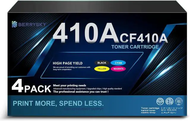 Package Contents:1 x 410A CF410A black toner, 1 x 410A CF411A cyan toner, 1 x 410A CF412A yellow toner, 1 x 410A CF413A magenta toner (Total 4 Pack)
