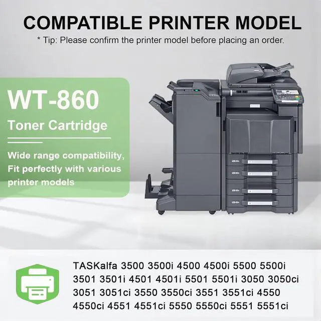 Compatible Printers for WT-860 Waste Toner Box: TASKalfa 3500 3500i 4500 4500i 5500 5500i 3501 3501i 4501 4501i 5501 5501i 3050 3050ci 3051 3051ci 3550 Printer