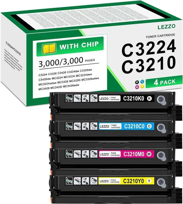 Products in the package: 4 Pack C3210 C3224 Toner Cartridges, 1x C3224 Black Toner (C3210K0) , 1x C3224 Cyan Toner (C3210C0) ,1x C3224 Yellow Toner (C3210Y0) ,1x C3224 Magenta Toner (C3210M0)