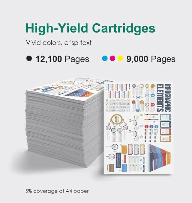 High Page Yield : Up to 12,100 pages per black toner cartridge,9,000 Pages per cyan magenta yellow at 5% coverage on letter a4