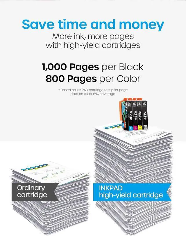 High Page Yield: Up to 1,000 pages for 923e Black Ink and 800 pages for 923e Color Ink at 5% coverage (A4/letter)