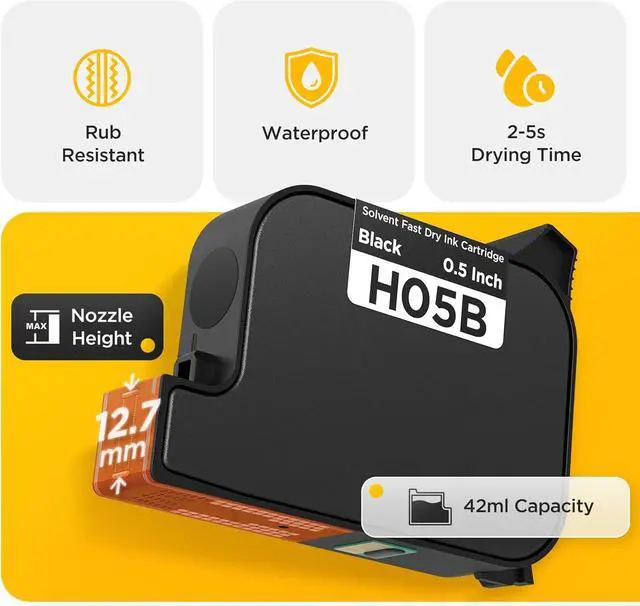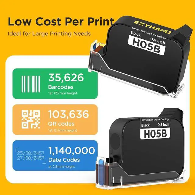 Original Ink for Ezyhand Printer: The H05B black ink is solvent-based ink cartridge with 42ml capacity. Print height 12.7mm (0.5 inch). Compatible with Ezyhand H50 handheld inkjet printer.