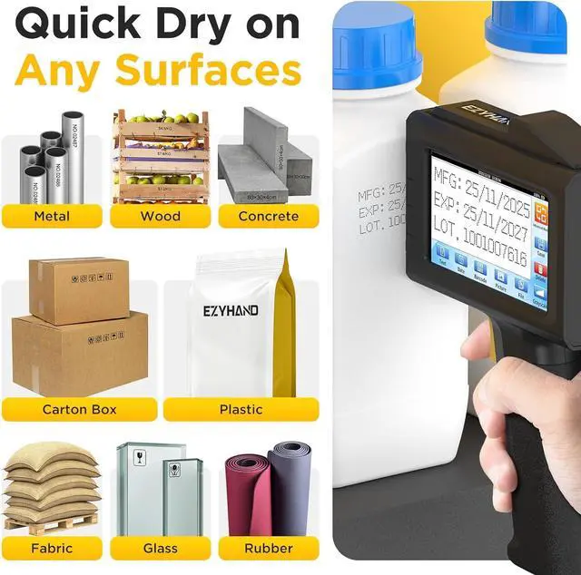 Fast Dry on Any Materials: Ezyhand ink cartridges use quick drying technology that allows ink to dry in 2-5 sec. Perfect for print clearly on any materials such as plastic, wood, carton box, metal, fabric and more.