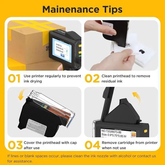 Maintenance Tips: For best performance, remove the cartridge when not in use and cover the nozzle with the protective cap to prevent drying. If clogging occurs, clean the nozzle with an alcohol wipe or contact support for assistance.