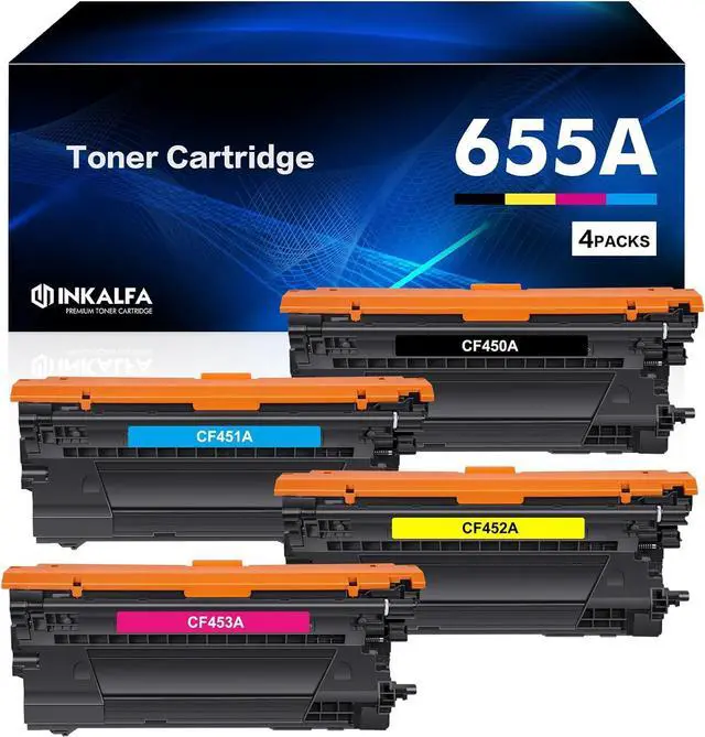 What's in the box: inkalfa Compatible toner cartridges Replacement for 655A CF450A Black CF451A Cyan CF452A Magenta CF453A Yellow Toner Cartridge