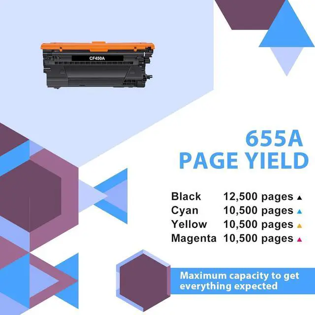 Page Yield: 12,500 pages per CF450A 655A black toner cartridge and 10,500 pages per color 655A CF451A CF452A CF453A toner cartridges (Letter/A4, at 5% coverage)
