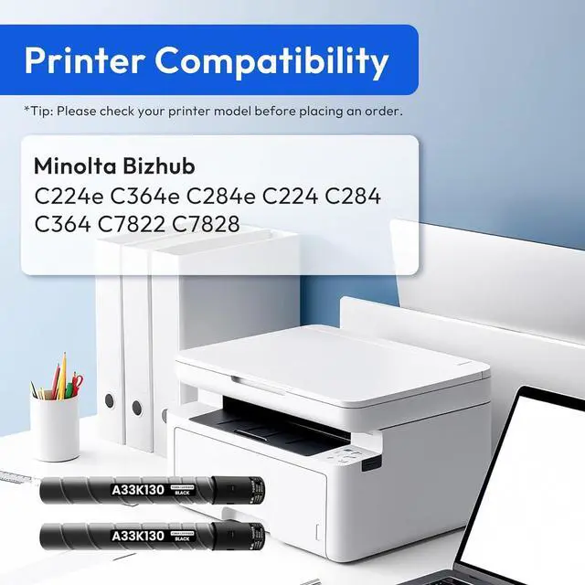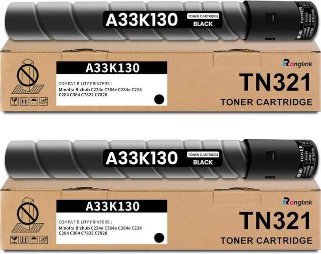 Package includes: 2 x A33K130 black toner cartridge replacement for Konica TN321 toner cartridge, TN-321 toner cartridge.