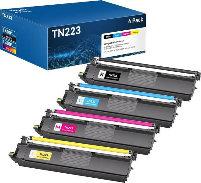 Package Contents: 4 Pack TN223 TN-223 color toner With Chip include 1 x TN223BK black toner, 1 x TN223C cyan toner, 1 x TN223M magenta toner, 1 x TN223Y yellow toner