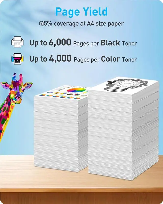 High Page Yield: Engineered for efficiency, delivering up to 6,000 pages from the black toner and 4,000 pages from each color toner (at 5% A4 coverage).