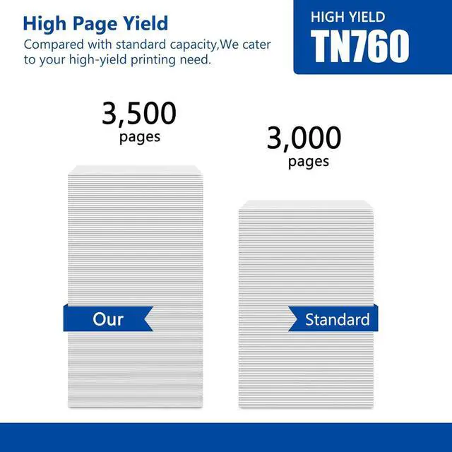 High Page Yield: Per TN-760 TN760 Toner Cartridge can print 3,500 Pages at 5% coverage (Letter/A4)