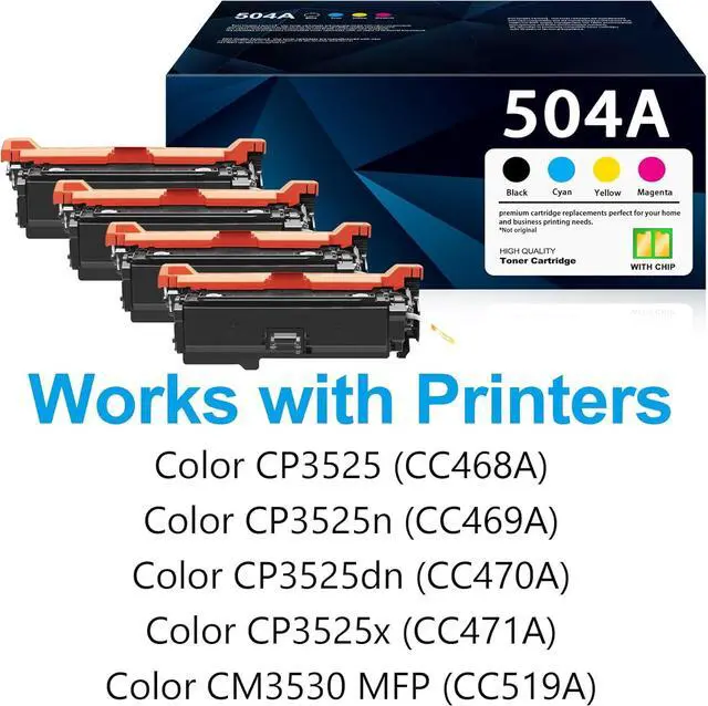 • What's in the box: 1x Black (CE250A), 1x Cyan (CE251A), 1 x Magenta (CE253A), 1 x Yellow (CE252A) 4-Packs of 504A standard yield toner cartridges with chips