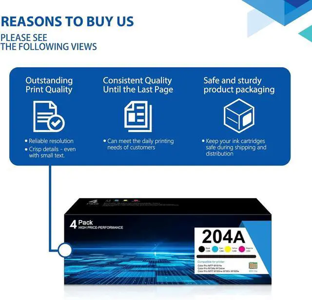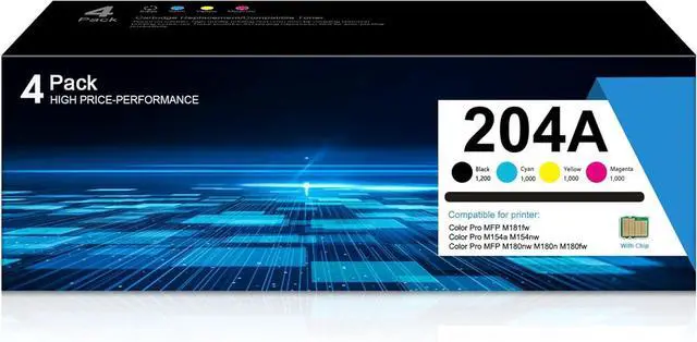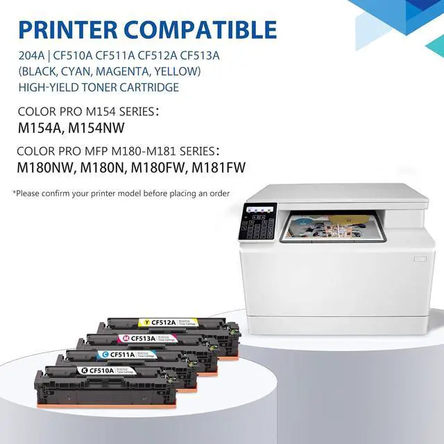 What's in the box: 4 new 204A Toner Cartridge (CF510A Black, CF511A Cyan, CF512A Yellow, CF513A Magenta)
