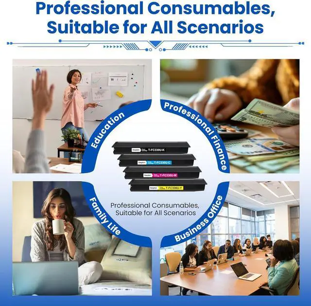Package Contents: 1 X T-FC415U-K black, 1 X T-FC415U-C cyan, 1 X T-FC415U-M magenta, 1 X T-FC415U-Y yellow, total 4 Compatible T-FC415 Toner Cartridges