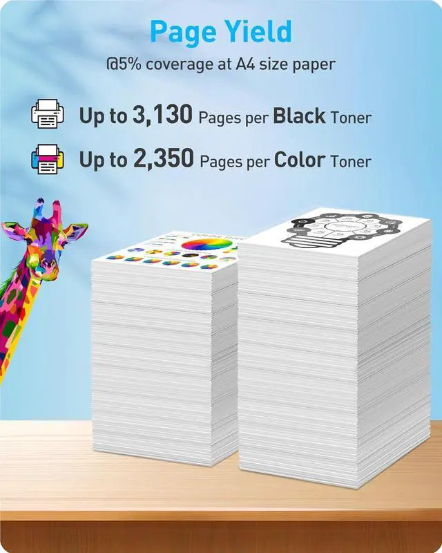 Page Yield: up to 3,130 pages per black toner, up to 2,350 pages per color toner, @5% coverage at A4 size paper