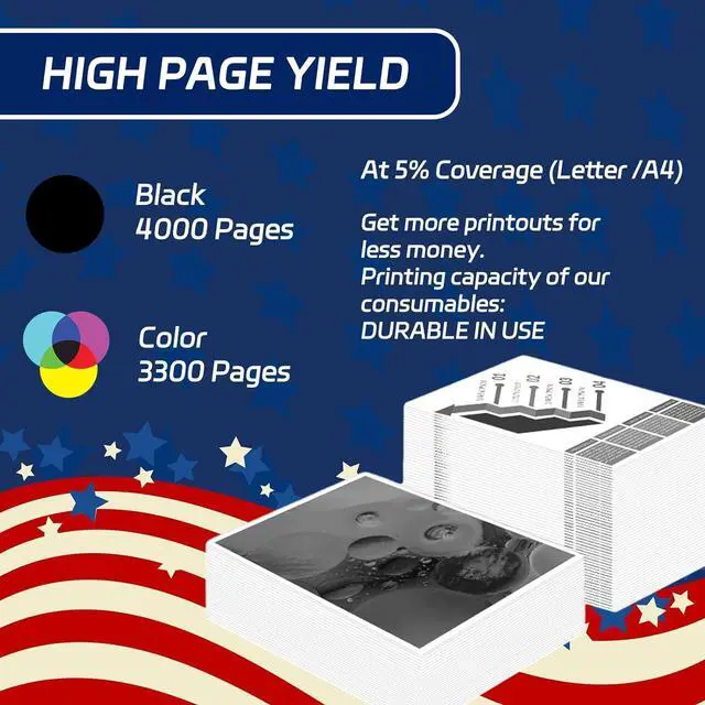 High Capacity: Our products are designed to print more pages, with large capacities that reduce the frequency of replacement. Black (BK/K) Print Pages: 4000 pages. Color Print Pages: 3300 pages (5% coverage on A4 paper)