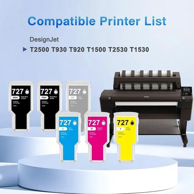 Compatible Printer List: Our 727 ink cartridge designed replacement for HP DesignJet T2500 T930 T920 T1500 T2530 T1530 printer ink, ensuring perfect alignment and functionality to keep office printers running smoothly, please confirm your printer model before placing the order.