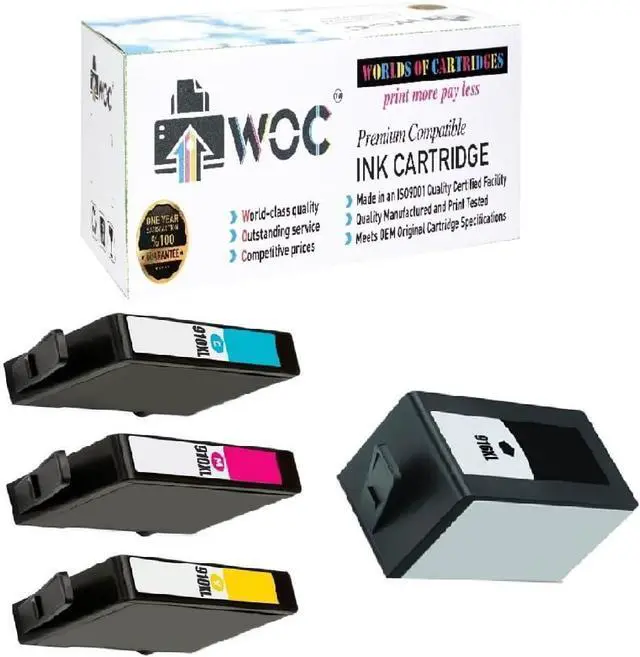 4-Pack XXL WORLDS OF CARTRIDGES Remanufactured Ink Cartridge Replacement for HP 910 / 910XL / 916XL (3YL58AN / 3YL59AN / 3YL60AN / 3YL61AN / 3YL62AN / 3YL63AN / 3YL64AN / 3YL65AN / 3YL66AN) (Jumbo: 162-400% Higher Yield compared to 3YL58AN / 3YL59AN / 3YL60AN / 3YL61AN) (Cyan + Magenta + Yellow + XXL Black). Each product is individually print tested and guaranteed to perform with compatible OEM fax/printer and does not void your fax/printer's warranty. FOR USE IN: HP OfficeJet 8010, 8010e, 8012, 8012e, 8013, 8014e, 8015, 8018, 8022 & OfficeJet Pro 8020, 8020e, 8024e, 8025e, 8028e, 8030, 8030e, 8034, 8034e, 8035, 8035e. YIELD: 1,500 pages (black) 825 pages per toner (color). WORLDS OF CARTRIDGES products are guaranteed to meet or exceed original OEM products in both print quality and page yield. They are primarily made in ISO 9001/14001 and STMC quality certified factories using the highest quality new and recycled components. WARRANTY: Premium 100% full lifetime guarantee. See WORLDS OF CARTRIDGES profile page for more information.