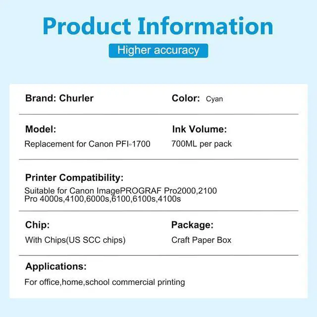 4.Pfi-1700 ink cartridge: Churler brand Pfi-1700 Pigment ink is strictly tested prior to leaving the factory, with precise parts, cartridges will be fully compatible with your printer. With quality ink, print with sharp text and vivid color images.