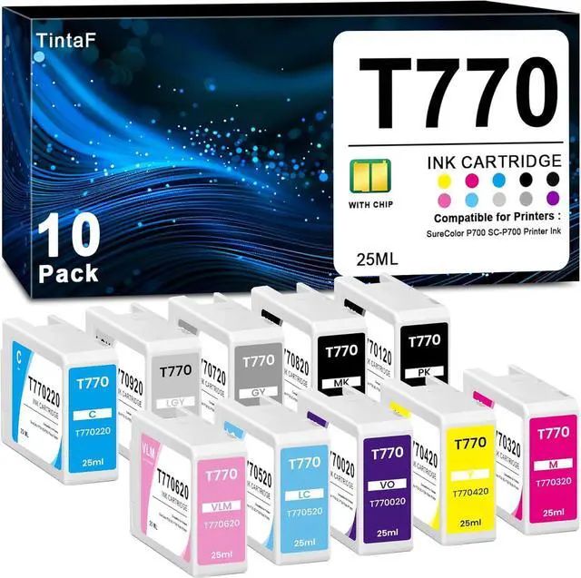 Product Name: TintaF Compatible for T770 Ink Cartridges 10-Pack - Violet (T770020), Photo Black (T770120), Cyan (T770220), Magenta (T770320), Yellow (T770420), Light Cyan (T770520)- Vivid Light Magenta (T770620), Gray (T770720), Matte Black (T770820), Light Gray (T770920)
