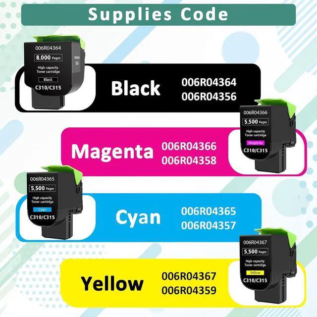 Compatible Printer:C315 toner cartridge Compatible for Xerox C310 C310DNI color printer and C315 C315DNI color multifunction printer.