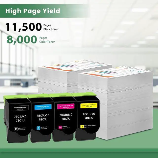 High Page Yield: Up to 11,500 pages per black 78C1U toner cartridge, Up to 8,000 pages per color 78C1U toner cartridge at 5% coverage of A4 paper