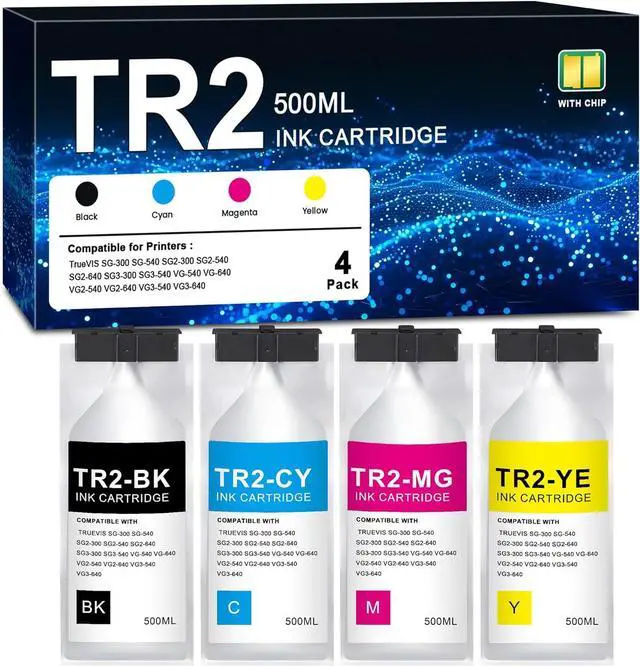 Package Contents: 1 X TR2 black TR2-BK, 1 X TR2 cyan TR2-CY, 1 X TR2 magenta TR2-MG, 1 X TR2 yellow TR2-YE, total 4 Compatible TR2 Ink Tank