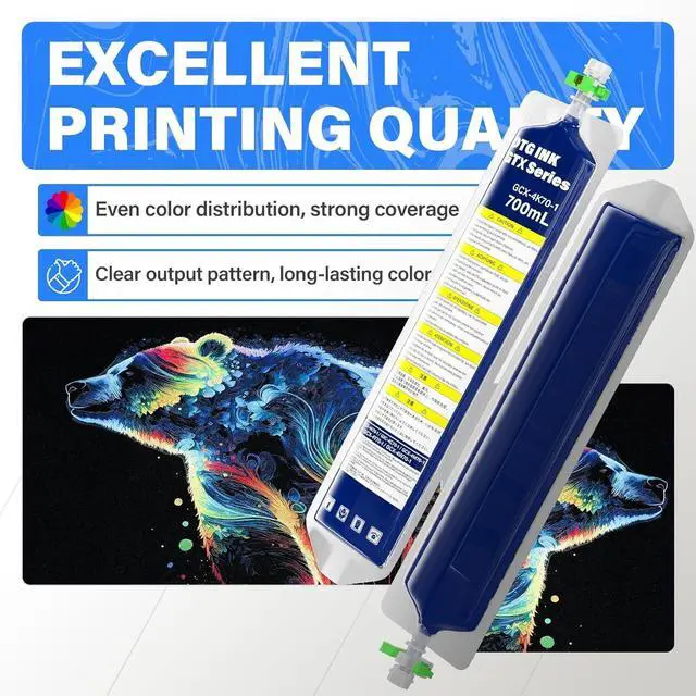 Pure Color: DTG Textile Ink Bag deliver sharp and precise printing with vibrant, long-lasting colors that stay true to their intended shades. Perfect for meeting your printing needs anytime.