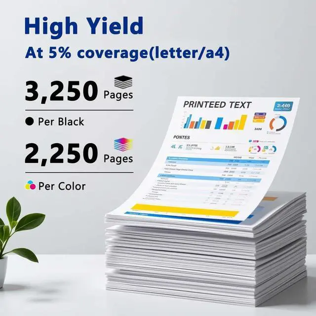 High Page Yiled: 3,250 pages per Black cartridge and 2,550 pages per Cyan Yellow Magenta Cartridge at 5% coverage (Letter/A4).