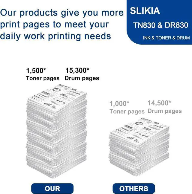 Page Yield: 1,500 pages per TN830 black Toner Cartridge at 5% coverage (Letter/A4); 15,300 pages per DR830 black Drum Unit at 5% coverage (Letter/A4).
