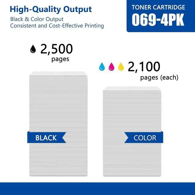 High Page Yield: 069 Toner Cartridge 2,500 pages per black, 069 Toner Cartridge 2,100 pages per color at 5% coverage (Letter/A4)