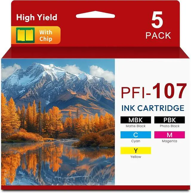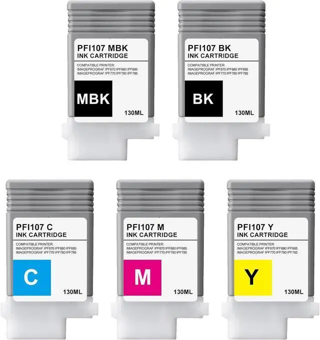 Remanufactured PFI-107 Ink Cartridge - PFI107 ink cartridge with 5 pack (Matte Black/PFI107MBK, Black/PFI107BK, Cyan/PFI107C, Magenta/PFI107M, Yellow/PFI107Y), upgraded materials and chip bring the perfect printing experience