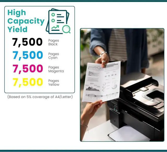 High Capacity Yield Pages - CB400A toner cartridge up to 7,500 pages for each black, CB401A CB402A CB403A toner cartridges up to 7,500 pages for each color, based on 5% coverage of A4/Letter