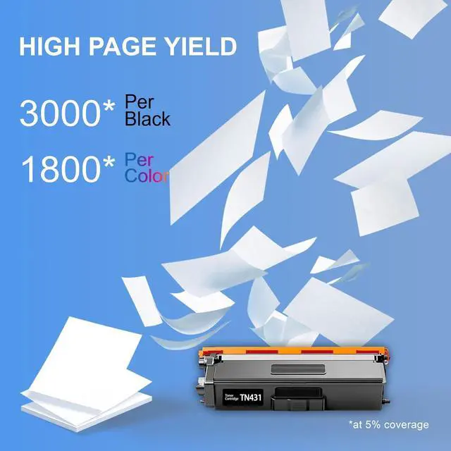 High Page Yield: Up to 3,000 pages per TN431BK toner cartridge; Up to 1,800 pages per TN431 C/M/Y Color toner cartridge (Letter/A4, at 5% Coverage)