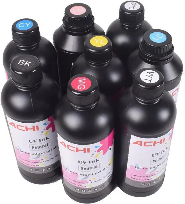 Packing List: The set includes 7 bottles of 500ml UV Hard ink in Cyan, Magenta, Yellow, Black, and White , Light Cyan, Light Magenta colors and Varnish.