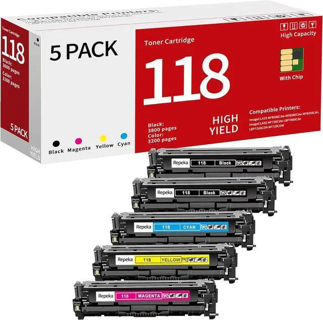 Package Contents: 5 Pack High Yield 118 Color Toner Cartridge Compatible Replacement for Canon 118 CRG118
