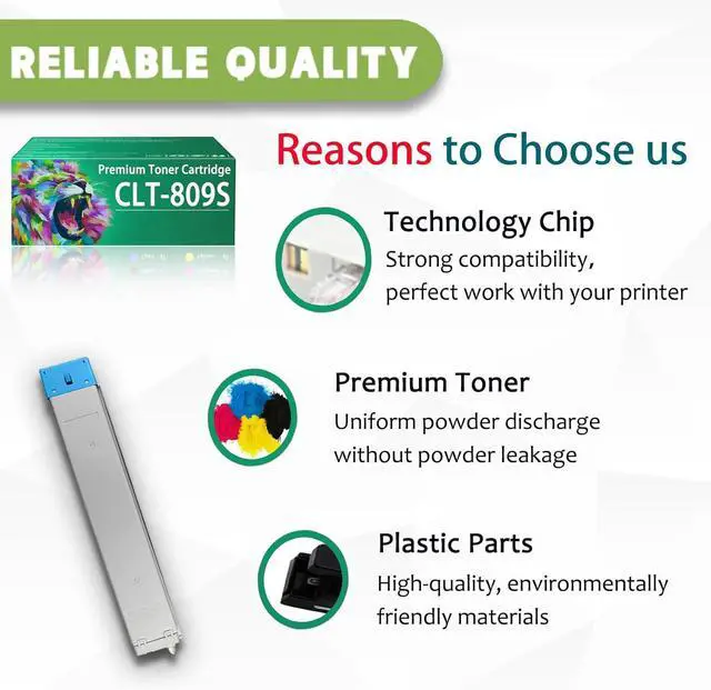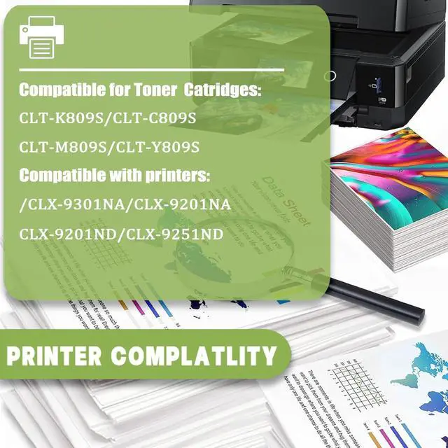 Compatible printers For Samsung CLX-9301NA CLX-9201NA CLX-9201ND CLX-9251ND printers. Toner volumes CLT-K809S Black toner cartridge: 20,000 pages. CLT-C809S Cyan toner cartridge: 15,000 pages. CLT-M809S Magenta toner cartridge: 15,000 pages. CLT-Y809S Yellow toner cartridge: 15,000 pages. This provides exceptional value for money and reduces the frequency of cartridge replacements. Package Contents: CLT-K809S Black toner cartridge 1pack. CLT-C809S Cyan toner cartridge 1pack. CLT-M809S Magenta toner cartridge 1pack. CLT-Y809S Yellow toner cartridge 1pack. Printing experience: This toner cartridge print is stably tested, provides outstanding results with clear fonts and realistic images, and ensures delivery of sharp text and vivid bright color. Stable output, easy to install, ready to use, safe and environmentally friendly, no pungent odor, giving you a healthy environment. Warm tips 1.Due to the different toner cartridge models in different regions, when purchasing toner cartridges, please confirm your original toner cartridge model and printer model number and send them to us.(To prevent you from buying a toner cartridge that is not compatible with your printer) 2.Make sure not to touch the chip on the toner cartridge for optimal performance. 3.Please note that if prompted with a non-original message, simply click 'OK' or 'Continue' to proceed and start using the toner.
