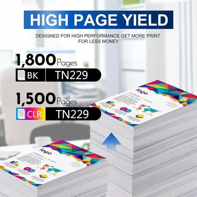 Page yield: Yields up to 1,800 pages per TN229 BK toner cartridge at 5% coverage(Letter/A4),Yields up to 1,500 pages per TN229 C/M/Y toner cartridge at 5% coverage(Letter/A4).
