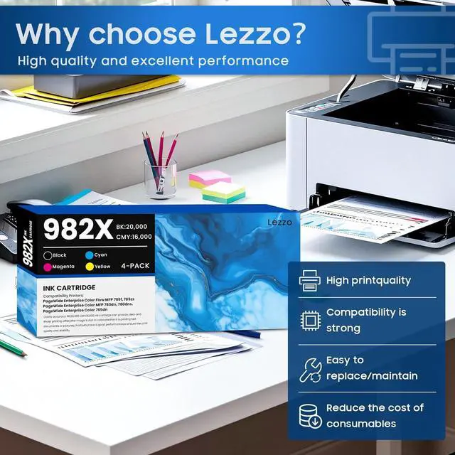Stability & Durability: Has good durability,can withstand a long time of use and high printing load.In the process of continuous printing,the Lezzo 982X Ink cartridge can greatly reduce the possibility of paper jam during the printing process, maintain stable print quality,and ensure the smooth progress of the work