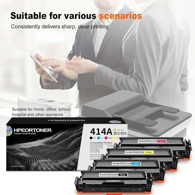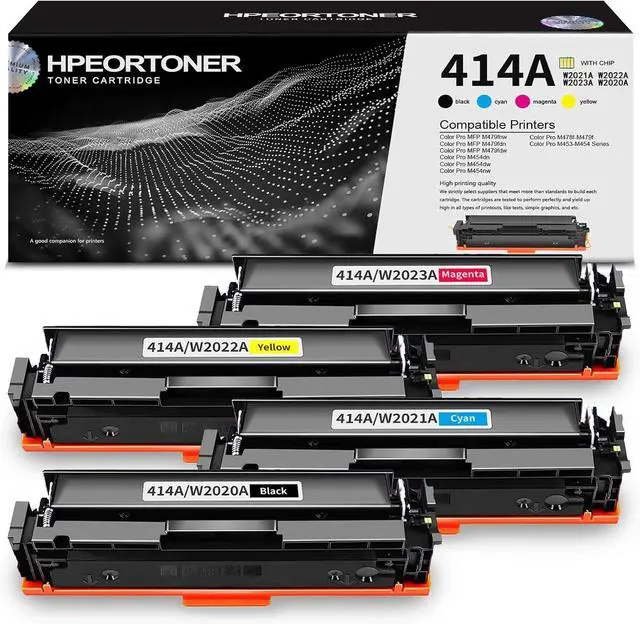 Package Included: 1 Pack 414A / W2020A Black Toner Cartridge, 1 Pack 414A / W2021A Cyan Toner Cartridge,1 Pack 414A / W2022A Yellow Toner Cartridge,1 Pack 414A / W2023A Magenta Toner Cartridge.
