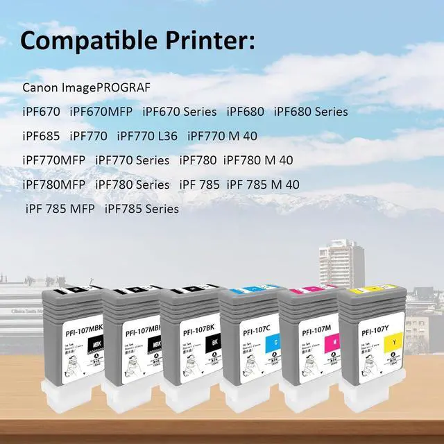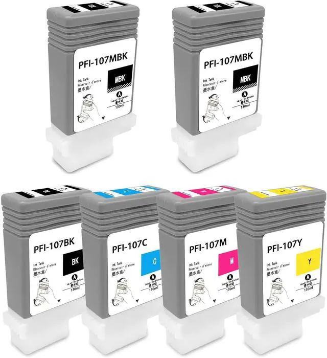 Package Content: 2 x PFI-107MBK (Matte Black), 1 x PFI-107BK (Black), 1 x PFI-107C (Cyan), 1 x PFI-107M (Magenta), 1 x PFI-107Y (Yellow). There are a total of 6 ink cartridges, each with a capacity of 130ml