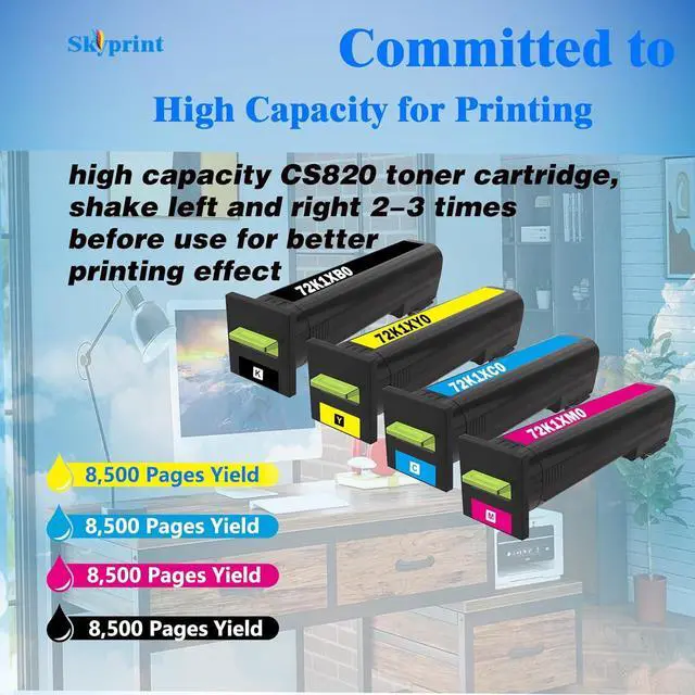 High Page Yield:up to 8,500 pages per CS820 black toner cartridge,8,500 Pages per cyan magenta yellow at 5% coverage on letter a4