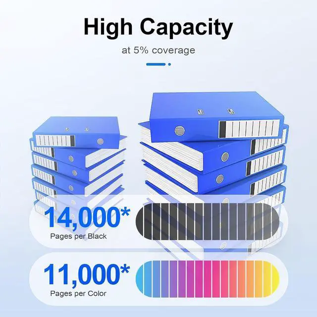 Cartridge yield (approx.): Page Yield: 14,000 pages per black toner cartridge, 11,000 pages per color toner cartridge at 5% coverage (Letter/A4)