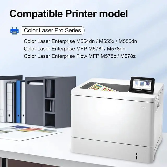 This cartridge works with: Color Laser Enterprise M554dn, M555dn, M555x; Color Laser Enterprise MFP M578f, M578dn; Color Laser Enterprise Flow MFP M578c, M578z Printer