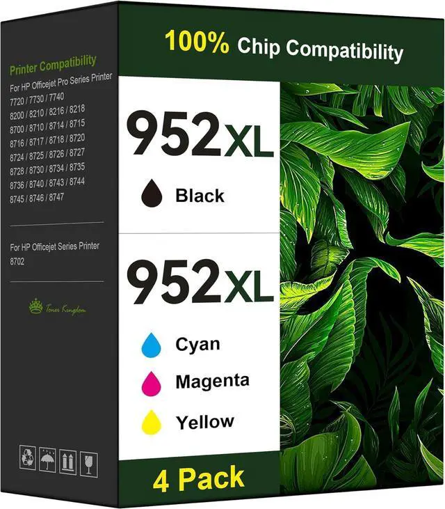 Package Content: Toner Kingdom Ink Cartridges Replacement for hp ink 952xl black and 952xl color combo pack (1 x 952xl Black ink cartridges, 1 x Cyan 952xl ink cartridges, 1 x Magenta ink cartridges1 x Yellow ink cartridges, Total 4 Pack)
